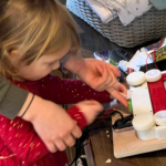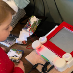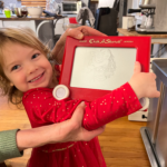 The original plan was to have the machine to draw each person’s face on an Etch-A-Sketch. Yes, it can draw realistic black and white faces and any other image. But it takes a long time to draw. Something like three hours to draw a portrait. So, plan “B”, TMW had the machine draw names, not faces. But some of the gifts contained special keys that told the machine to draw a cool picture. Our three-year-old granddaughter very much enjoyed her picture of Moana!