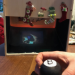 At first a video of a fire plays continuously inside the box. But when a guest roasts a marshmallow, the scene changes to a ghostly head floating in the void. The disembodied head begins dim and faded. Then, in a short time, the figure grows into focus. The result: sudden hallelujah laugher-filled cheers erupt from onlookers peering into this strange diorama: “Hey. Whoa! Cool! That’s Diane!”, or “Woohoo!, It’s me!” The person who grew from the flames during this round becomes the next recipient of a gift from The Mad Wrapper!