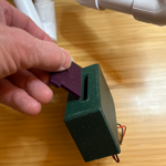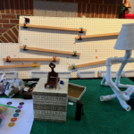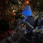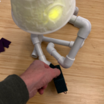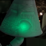 This Thinking Man is a “lamp” is made from PVC pipe, some 3D printed shapes, simple electrical switches, wires and LEDs. It resembles a man sitting, contemplating a slot he has discovered that was cut through the side a mysterious green box resting at his feet. On inspection, one will notice that the lampshade sitting atop of the man’s shoulders is strangely uneven like a miniature mountain range — enough to give pause to a real person to contemplate meaning.